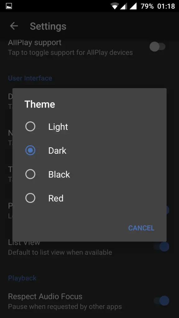 Visual appeal is one of the factors which people consider before downloading the app. The app offers you a choice of themes which you can customize according to your choice. You have an option of four themes, namely Light, Dark, Black and Red.You can also change the default screen between Albums, Artists, Songs, Magic Radio. You can also change the default screen to Video but be careful as this feature is still in beta.