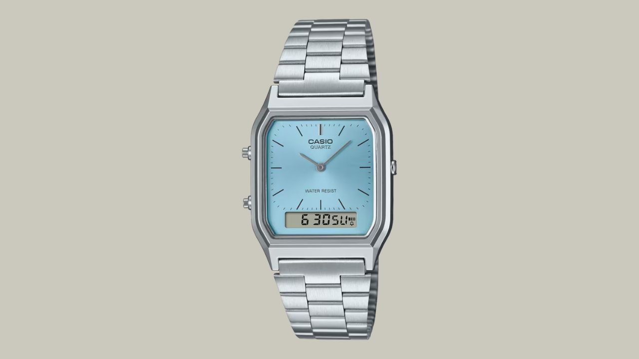 - Casio expands its vintage lineup with the new Casio hybrid watch AQ230A-2A1M, featuring a trendy ice blue dial paired with a classic stainless steel analog-digital design.