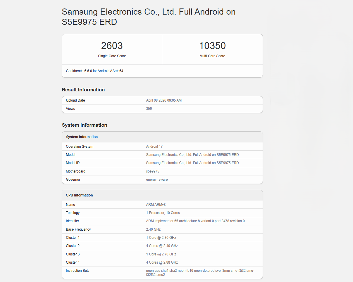 According to the Geekbench database, the Exynos 2700 SoC scores 2,603 points on the single-core and 10,350 points on the multi-core benchmark. To be honest, these are not impressive scores; however, given the fact that the chipset is still in its early testing phase, the performance can be muted and will be refined in future iterations.