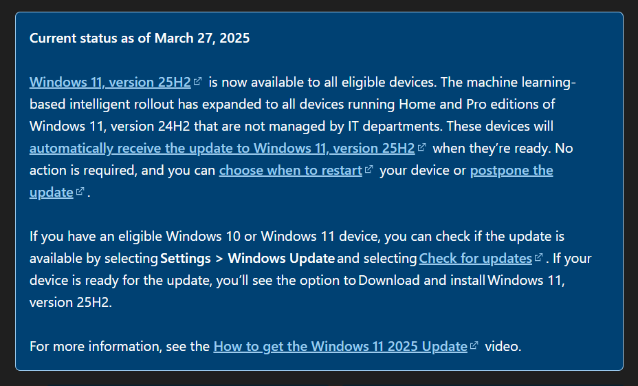 Based on details from Microsoft’s Windows 11 25H2 support page, the automatic rollout mainly affects devices running Home and Pro editions of Windows 11, version 24H2. PCs that are managed by businesses, schools, or IT administrators are not included in this rollout for now.