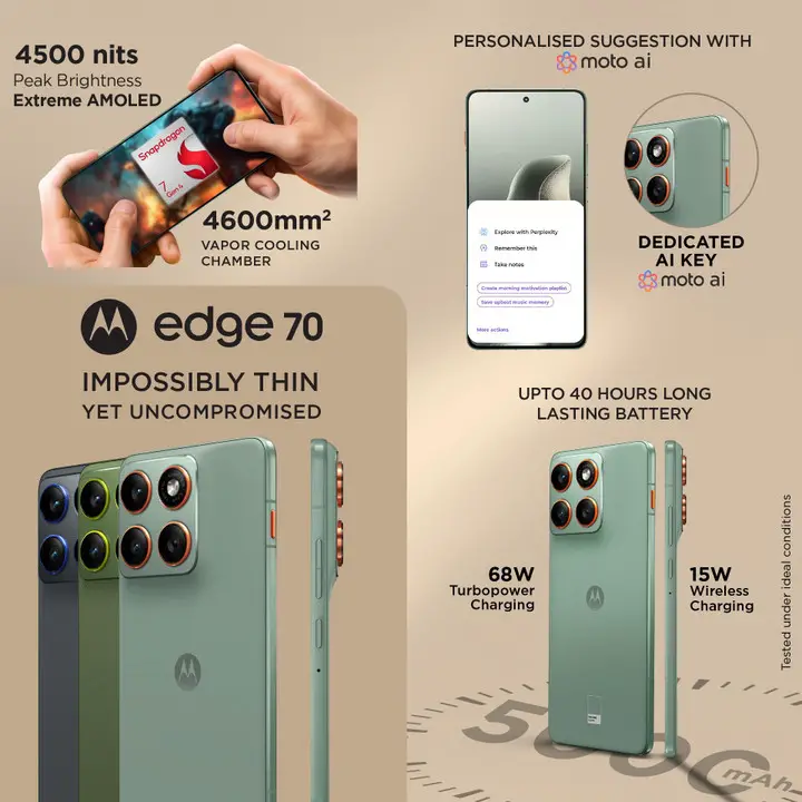 - motorola edge 70 features a 6.7-inch 1.5K AMOLED display with a 120Hz refresh rate, offering high brightness and a slim 5.99mm metal design.
