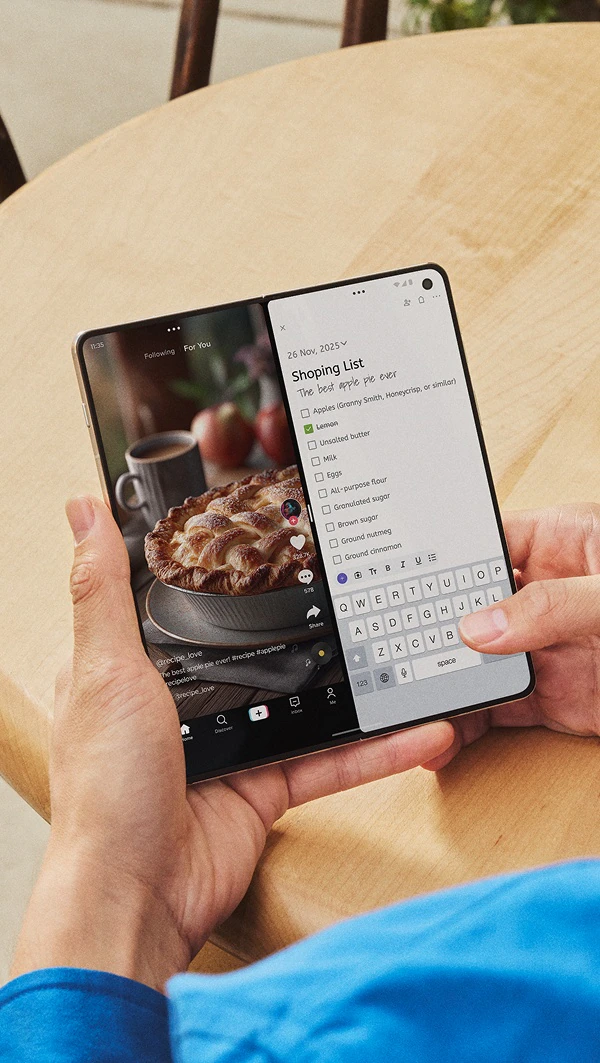 For front-facing use, the phone includes a 32MP camera on the outer display and a 20MP camera on the inner screen, supporting video calls and selfies in both folded and unfolded modes.