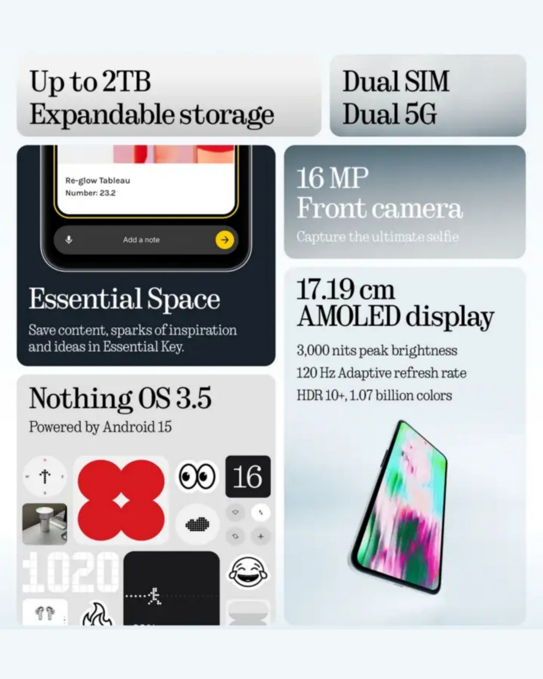 • Packs a 5000mAh battery with 33W fast charging and runs Android 15 with Nothing OS 3.5, with three OS updates promised.
