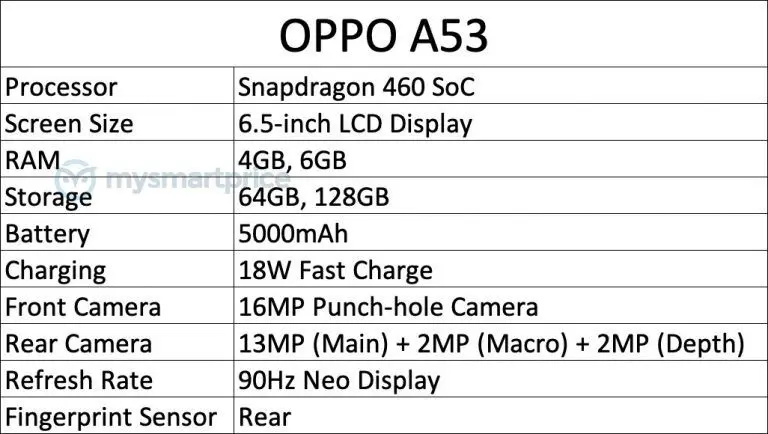 According to a new report from MySmartPrice, the Oppo A53 2020 is going to be launched soon, and its specifications have been leaked. The phone will be powered by Qualcomm’s latest entry-level Snapdragon 460 SoC, paired with 4/6GB RAM and 64/124GB internal storage. On the front, it will sport a 6.5-inch LCD display with a refresh rate of 90Hz. There will be a cut-out on the top to house a 16MP punch-hole camera. Talking about the rear cameras, we’ll see a triple camera setup with a 13MP main sensor, 2MP depth sensor, and a 2MP macro lens. The phone will get its juice from a big 5000mAh battery that’ll charge fast, thanks to the 18W fast charging support. The fingerprint sensor will be placed on the back.