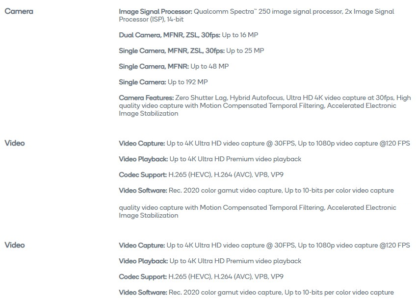 The comprehensive list includes the video codecs supported by the revised ISP catalog as well. SDM845 supports 4K ultra HD video at 60 fps with features like active depth sensing, hybrid autofocus, MFNR, and more.