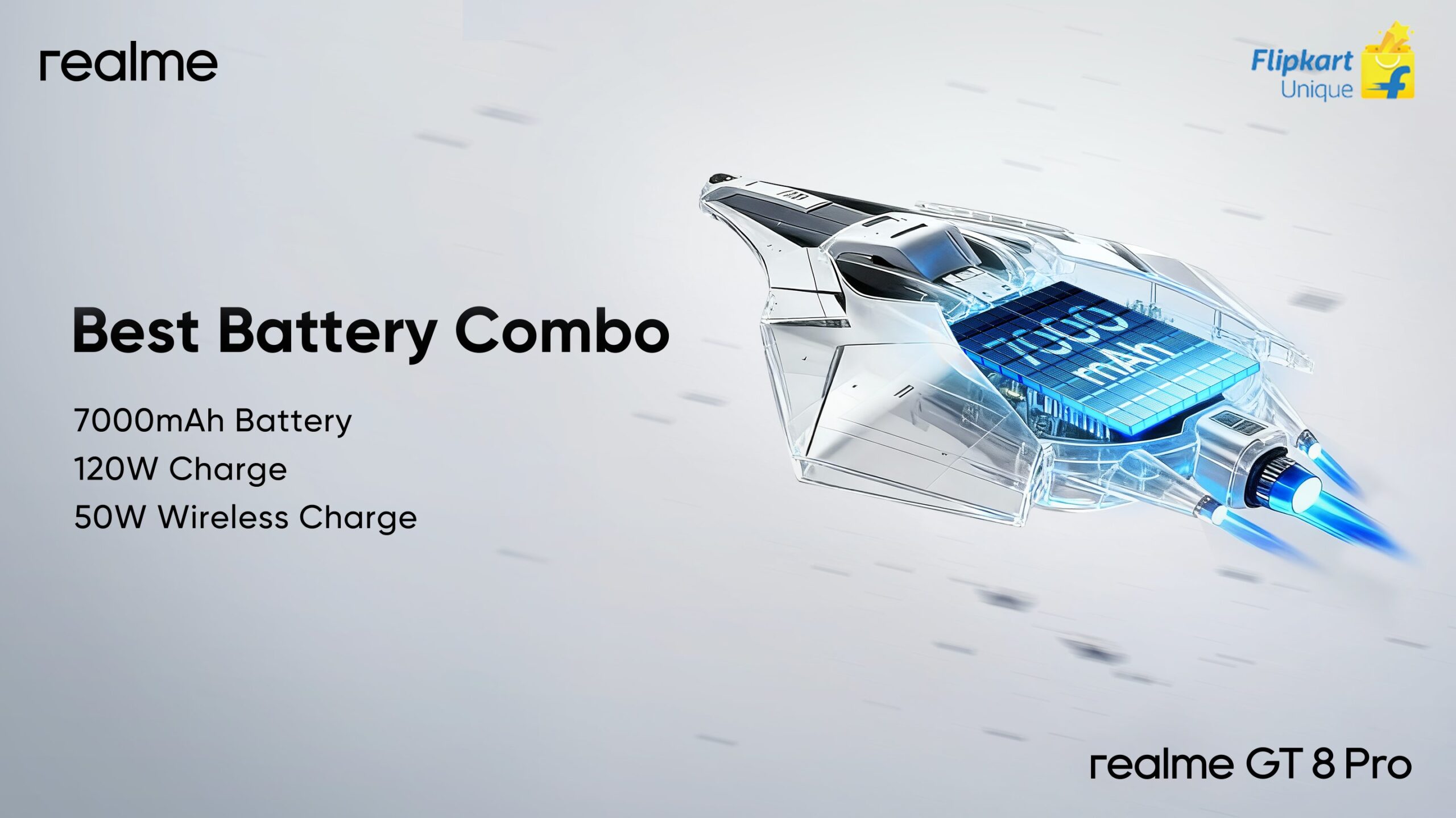 The realme GT 8 Pro features a 7000mAh battery paired with 120W SuperVOOC fast charging, designed to deliver a full charge in just minutes.
