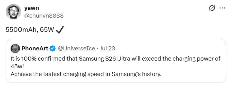 Tipster @chunvn8888 on X (formerly Twitter) said that the upcoming Samsung Galaxy S26 Ultra might upgrade from a paltry 5,000mAh to a slightly larger 5,500mAh battery. This is a 10% bump and a lot better when it comes to honing your flagship phone against heavy-duty tasks such as a movie marathon or playing AAA games for hours.
