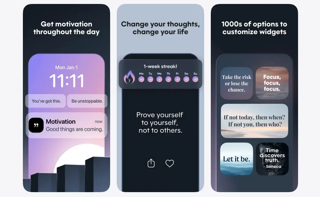 Motivation is a widget app that channels short but effective motivational quotes from different sources and spreads across different categories. It sends out daily motivations on widgets, which is technically the first thing you see when you pick up your iPhone. Change colors and fonts, set up home screen widgets, save or share quotes, and more with this positive reinforcement app.