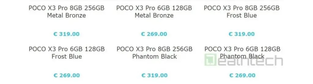 - Poco X3 Pro will be available in at least three colors i.e. Frost Blue, Phantom Black, and Metal Bronze. Starting with the base 6GB+128GB, it will arrive at a price tag of €269 for both color variants. The higher 8GB+256GB variant clad in Phantom Black, Frost Blue, or Metal Bronze is available at a price tag of €319.