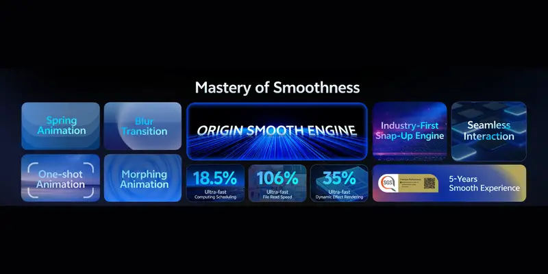 Simplified layouts in iManager and Origin Health improve usability, and Immersive Weather delivers animated environmental scenes. Personalization features include a Lock Screen Grid for flexible widget placement and photo blending, plus a 4×7 Home Screen Grid with adaptive folders and Flip Cards that respond to device motion.