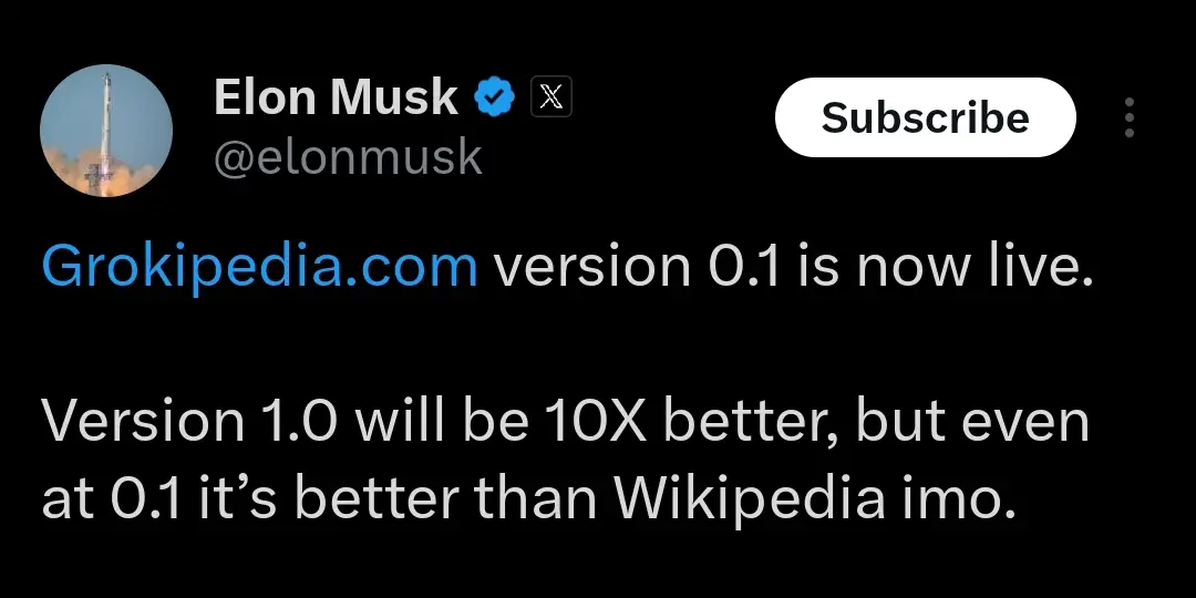In a post on X (formerly Twitter), Elon Musk said Grokipedia is built to “outperform Wikipedia, even at Version 0.1.” He added that Version 1.0 will be “ten times better.” xAI’s goal is to build a faster, more reliable, and more scalable alternative to traditional crowd-sourced encyclopedias.