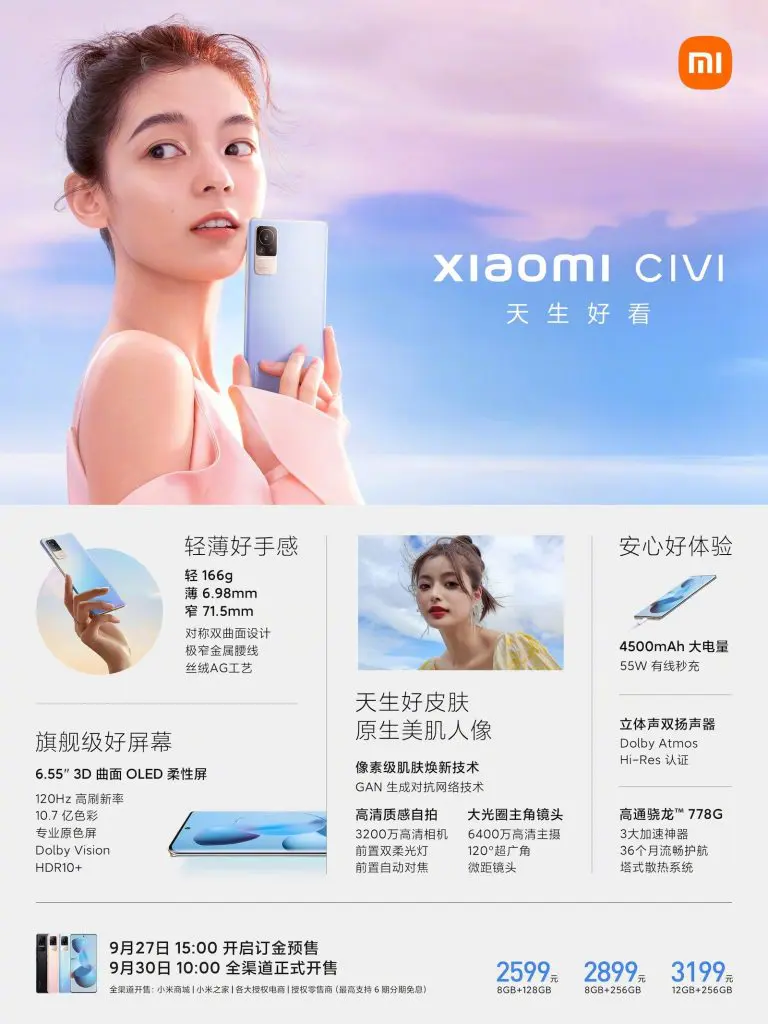 Xiaomi Civi is now available for pre-sales in China and the availability on both online and offline channels will commence from September 30. The device is available with its base configuration of 8GB+128GB at CNY2,600 ($400) while the higher 256GB variant is up for grabs at CNY2,900. Finally, the highest 12GB+256GB model is up for sale at CNY 3,200. Note that this pricing is for the Chinese market only and the converted amount is for reference.
